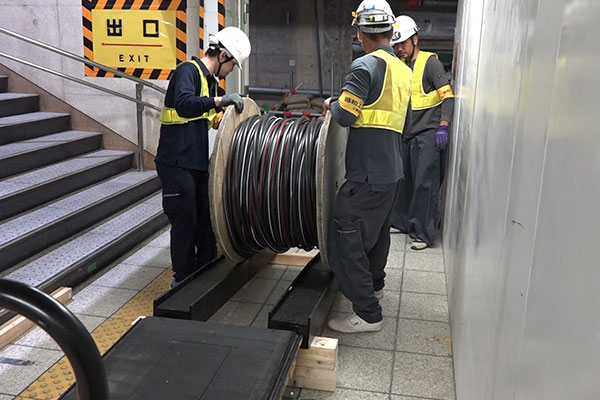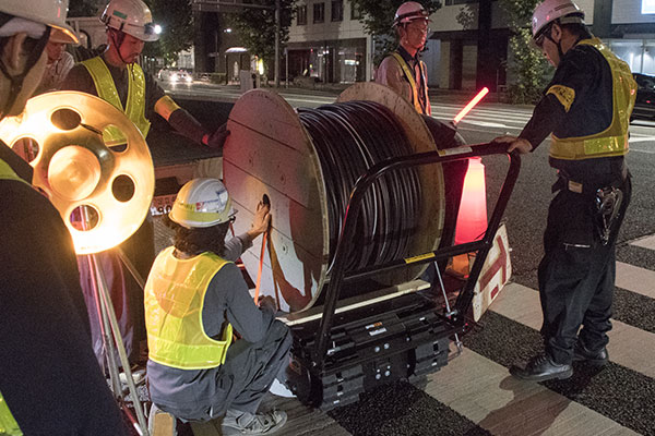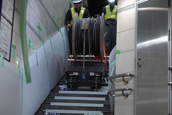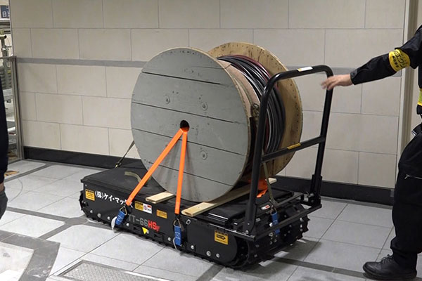 通信ケーブルドラムを電動重量物運搬台車を使用して施工場所まで搬入しました。
