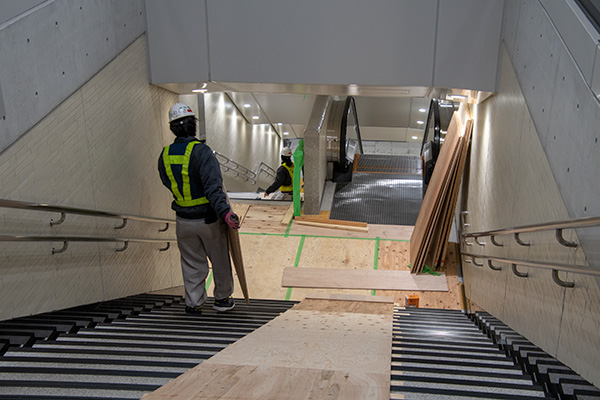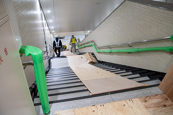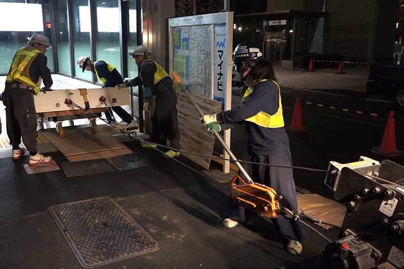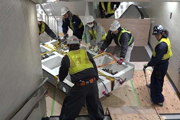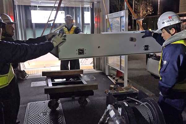 止水扉(約1.2t)を仮設スロープと油圧ウインチを用いて階段搬入しました。