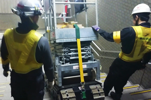 電動重量物運搬台車、階段昇降台車、仮設スロープ+ウインチなどを用いて、運搬する物品の重量・大きさ、現場の状況に応じた最適な方法で確実に階段運搬をいたします。