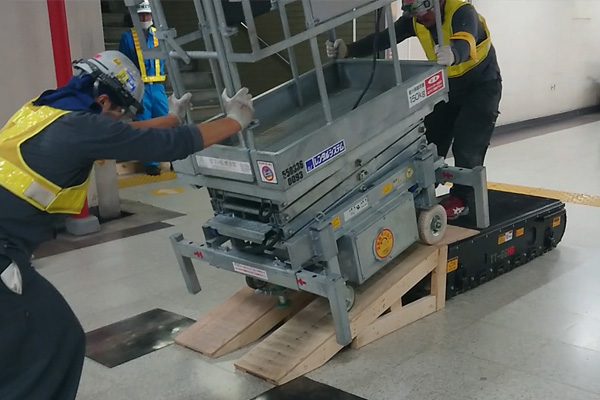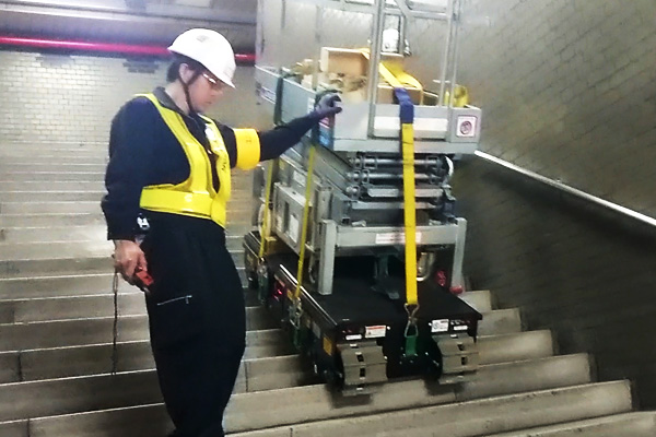 高所作業台(約370kg)を電動重量物運搬台車で階段搬入しました。