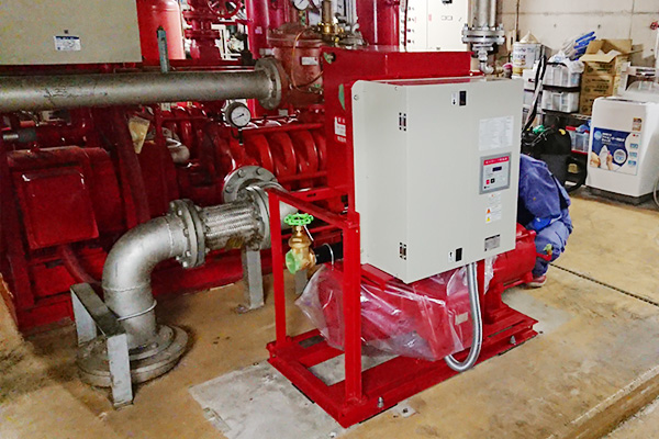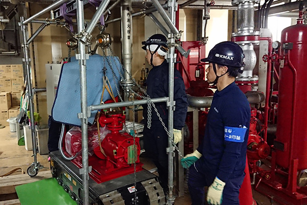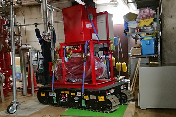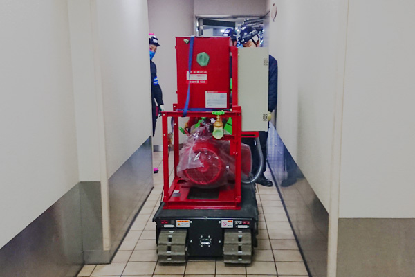 電動重量物運搬台車でスロープから消火ポンプユニットを搬入