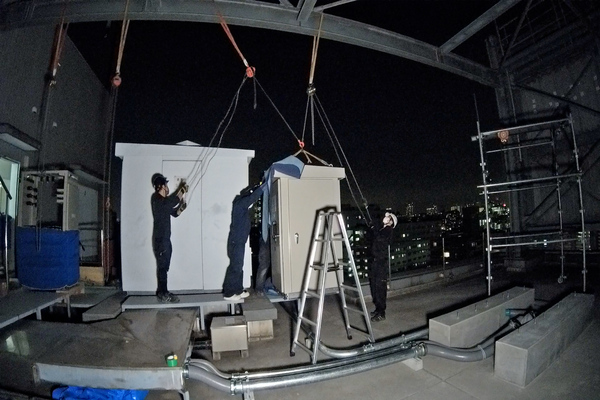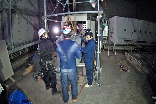 キュービクル函体(375kg・230kg・190kg)、トランス(580kg・215kg)階段運搬・据付作業を行いました。
