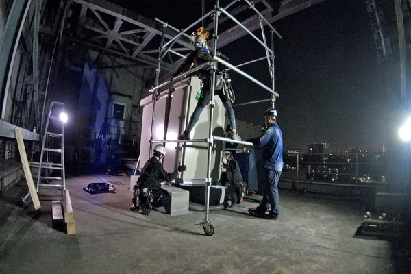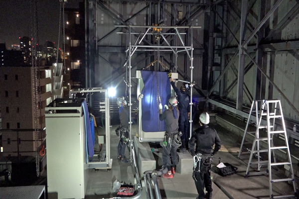移動式やぐらを組みキュービクル函体(375㎏)を吊り上げ、アンカー上まで移動
