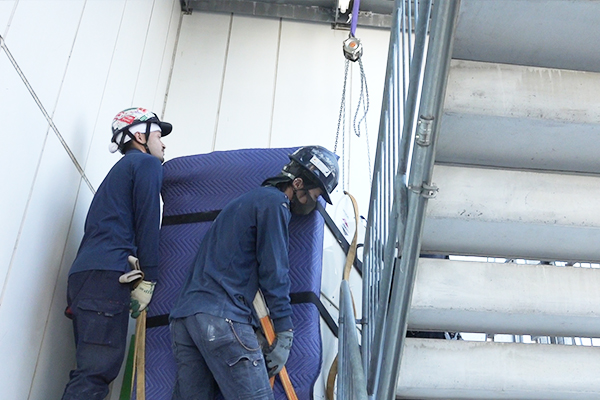 電動重量物運搬台車、階段昇降台車、仮設スロープ+ウインチなどを用いて、運搬する物品の重量・大きさ、現場の状況に応じた最適な方法で確実に階段運搬をいたします。