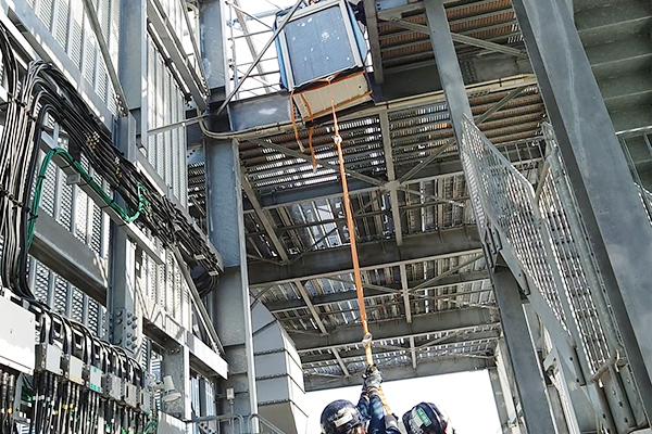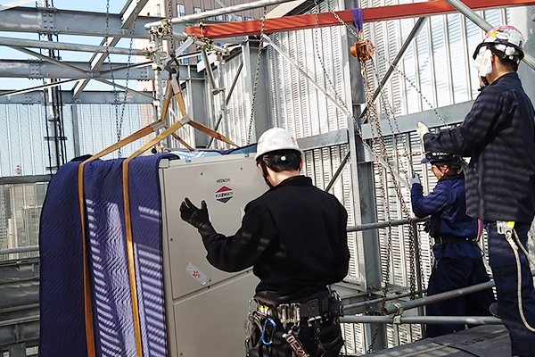 足場を設置しチェーンブロックで約6mの高さを吊り上げ