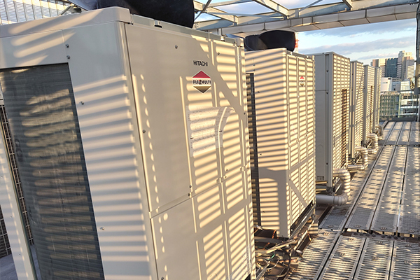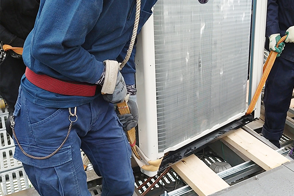階段昇降台車を使用して室外機(約200kg)を2基、階段運搬・据付しました。