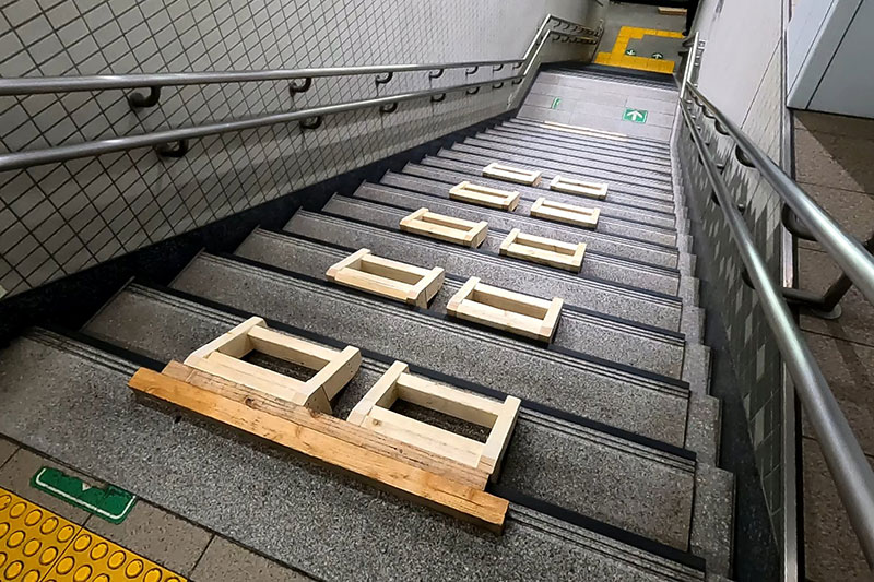 偏荷重を防ぎ階段の角を保護する機材を設置