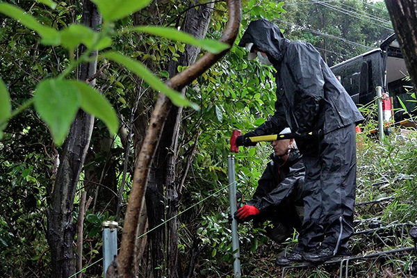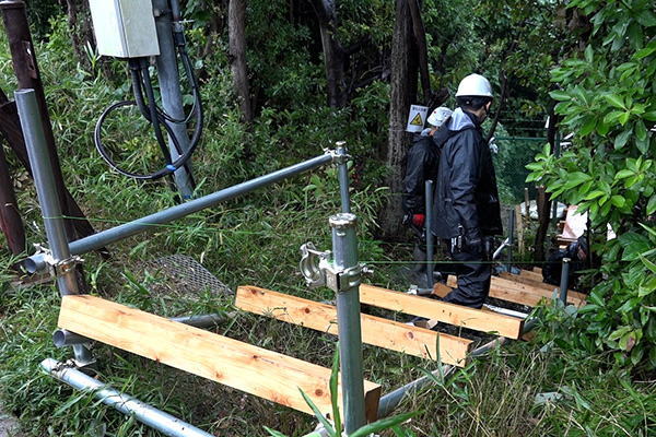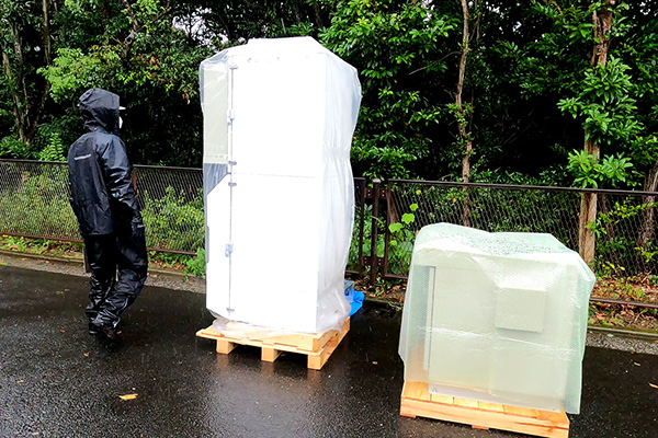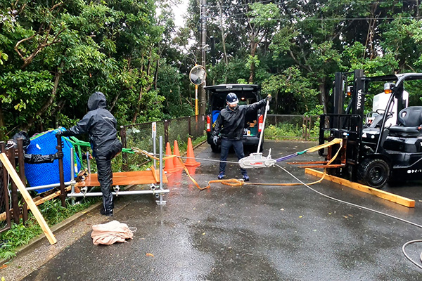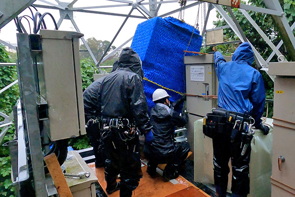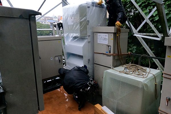 傾斜面にスロープを仮設して電源設備:約400kg、約100kgを搬入しました。