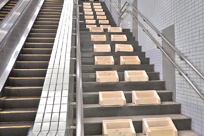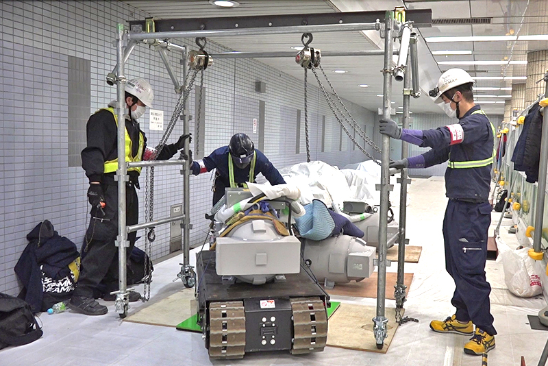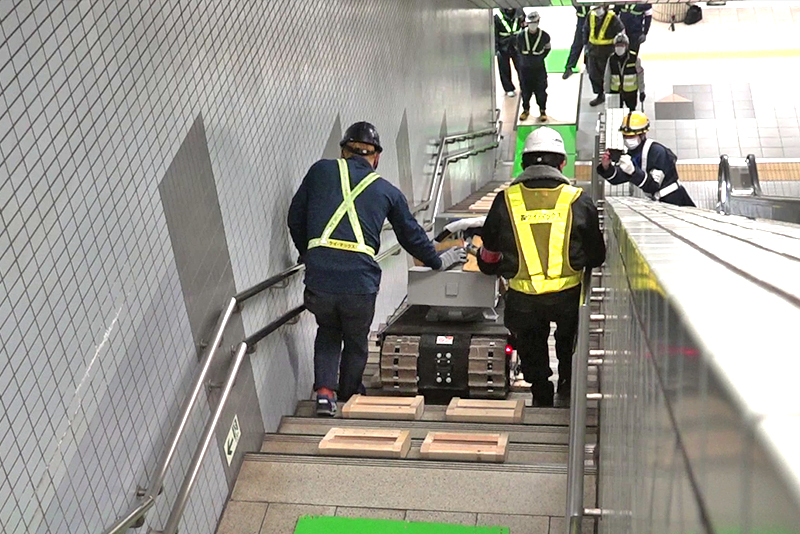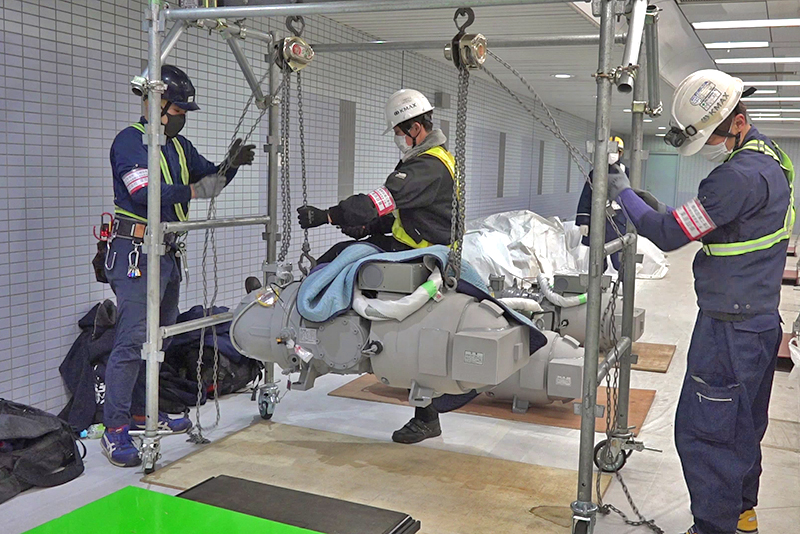 地下鉄の階段に架台を設置し約450kgの圧縮機を搬入しました。